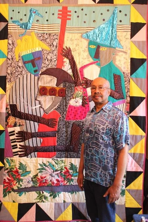 Michael A. Cummings (b. 1945) is widely regarded as the foremost African American male quilter in the United States, exerting a significant influence on contemporary quilt artists. Originally from Los Angeles, Cummings relocated to New York City in 1970, where he immersed himself in the vibrant cultural scene. He formed friendships and engaged in dynamic dialogues with prominent artists of the time, such as Norman Lewis, Camille Billops, and Romare Bearden and his wife. Inspired by Bearden’s work, he began experimenting with collage construction in 1973, eventually transitioning to fabric collage compositions using appliqué techniques. During this time, he also earned an Art History degree with studio art courses from the State University of New York. Cummings resides in Harlem, where he lives and works in a 120-year-old brownstone filled with an eclectic collection of African, African American, and multicultural art acquired from his international travels. Now retired from a full-time role with the New York State Council on the Arts, Cummings dedicates his time to researching African American culture and quilt making, transforming this history into narrative quilts.